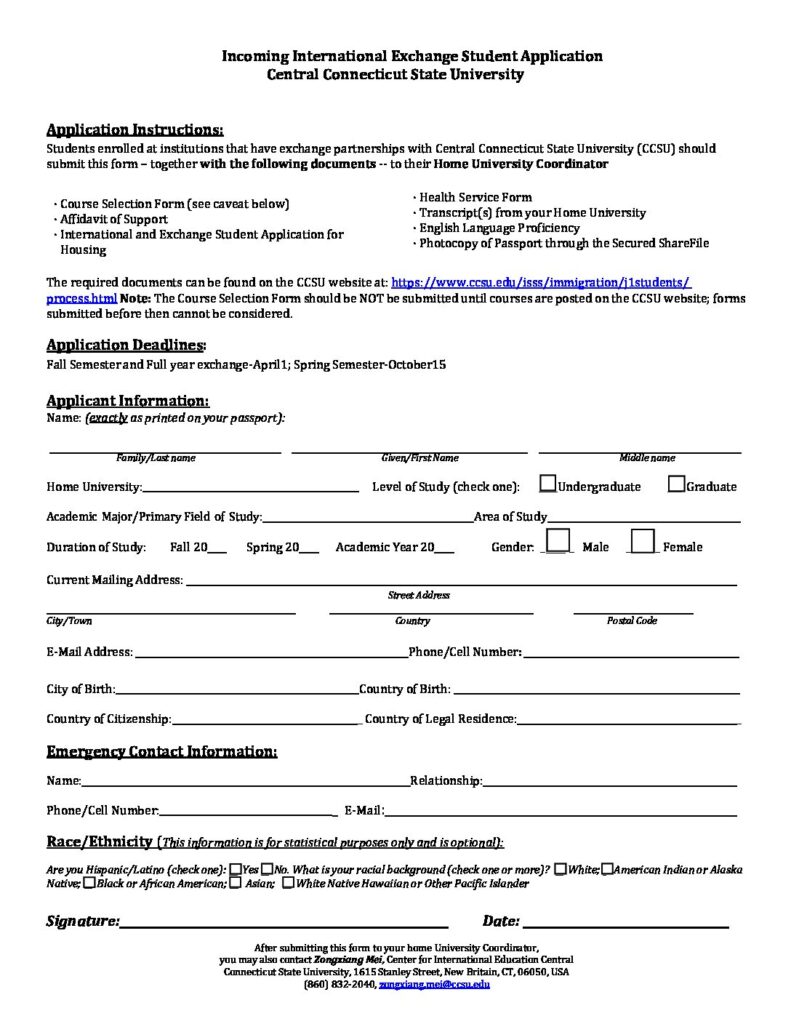 大学の寮に住む場合はこちらの書類を記入する必要があります。私の場合は関西外国語大学の規定によって一番安い寮を申し込みする必要がありましたが、制限がない方は好きな寮を選んでください。私の通っているセントラルコネチカット州立大学には4種類の寮があります。個室の部屋、2人部屋、4人部屋などがあります。寮によって室内の設備や値段が違うのでよく確認してから選択してください。基本的に2人部屋になると思います。