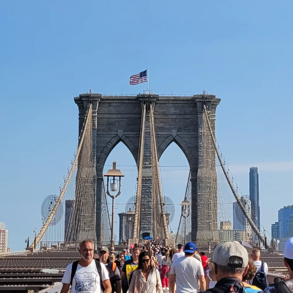ブルックリンブリッジは有名な写真スポットです。この橋はアメリカで最も古いつり橋ですが、歩く場所の下には車が走っています。今でも現役の橋です。橋を渡りきるには30分ほどかかります。橋を渡りきっても何もないので、真ん中まできたら折り返しましょう。